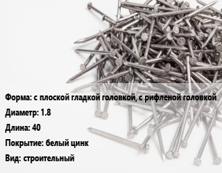 Гвоздь с плоской гладкой головкой, с рифленой головкой 1.8х40 белый цинк строительный