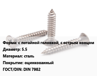 Саморез с потайной головкой, с острым концом D=5.5 сталь оцинкованный ГОСТ: DIN 7982