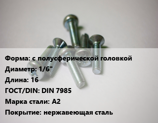 Винт с полусферической головкой 1/6"х16 DIN 7985 Сталь: A2 нержавеющая сталь
